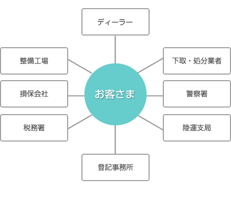 自社で車両を購入(所有)した場合、お客さまが各関係会社や所轄の機関に申請・支払い等、煩雑な事務処理を行わなくてはなりません。